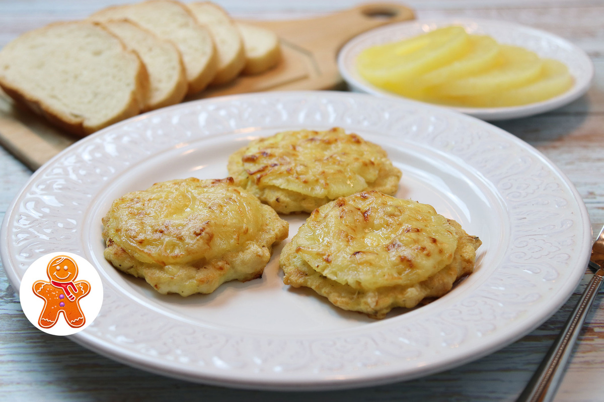 Затем подготавливайте формочки для котлет. В центр каждой котлетки укладывайте по кружочку ананаса и щедро покрывайте тертым сыром. Обжарьте на сковороде до золотистой корочки, после чего доведите до готовности в духовке.