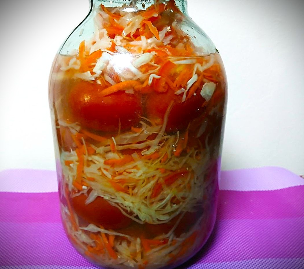 Сначала шинкуют капусту, режут перец и трем морковь. Элементы перемешивают с чесноком и петрушкой. На дно банки кладут петрушку и душистый перец, чередуют слои капусты и помидоров, чтобы не было пустот. Затем добавляют маринад: соль, сахар и уксус, дополняют водой до горлышка. Банку стерилизатируют полчаса, затем закрывают крышкой, переворачивают и укутывают до остывания.