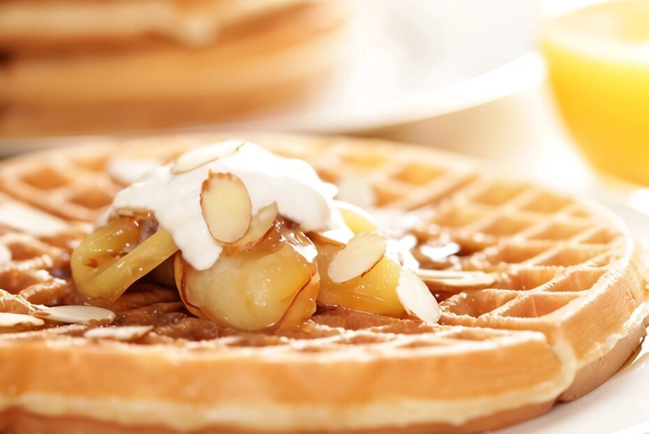 Эти аппетитные овсяные вафли — отличный выбор для вегетарианцев и тех, кто соблюдает пост. Они представляют собой интересную вариацию на тему традиционных бельгийских вафель, и готовятся с использованием пшеничной и овсяной муки, смешанных с миндальным молоком и соевым йогуртом. Вместо яиц используется льняная мука, которая придаёт тесту необходимую клейкость и помогает ему не рассыпаться. Хотя избавиться от глютена в этом рецепте не получится — без него вафли не поднимутся должным образом, так что стоит это учесть. Подавать такие вафли лучше всего с ломтиками банана, медом или вареньем, избегая при этом животных жиров.