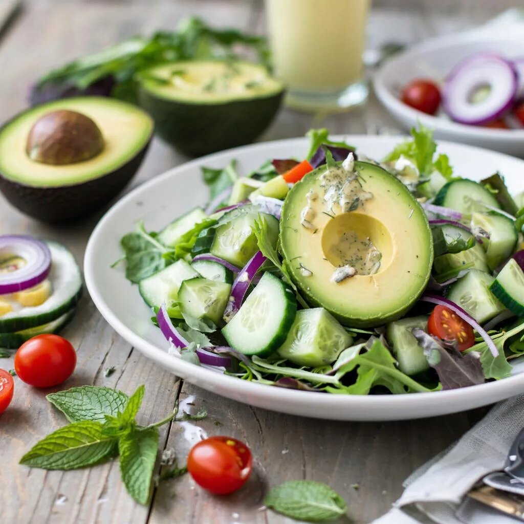 Лучше всего подавать салат сразу после приготовления, чтобы авокадо осталось свежим и мягким. Для украшения используйте дополнительные веточки зелени.