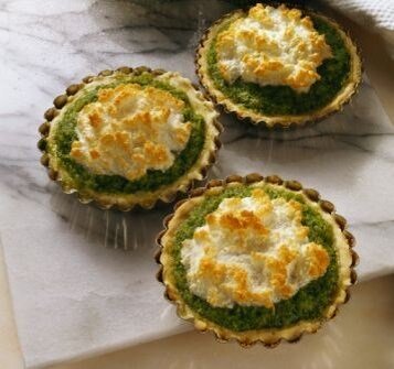 Разогрейте духовку до 220°C. Подготовьте два круглых противня диаметром 10 см. Нарежьте слоеное тесто на квадраты 15 см и растопите сливочное масло. Смочите тесто маслом, уложите по два квадрата в каждую форму, создав подобие короны. Выпекайте в течение 2–3 минут до появления золотистой корочки.Тем временем промойте шпинат под кипящей водой, добавив остатки масла, и слейте излишки жидкости. В глубокой миске смешайте сливки, желток, натертый пармезан, а также добавьте специи и шпинат. Перемешайте до однородной массы.Доставайте тарталетки из духовки и наполните их шпинатной смесью. Верните в духовку и выпекайте еще 4-5 минут.На сухой сковороде обжарьте кедровые орехи до золотистого цвета. Готовые тарталетки сервируйте на тарелках, посыпьте обжаренными орехами.Советы по подаче