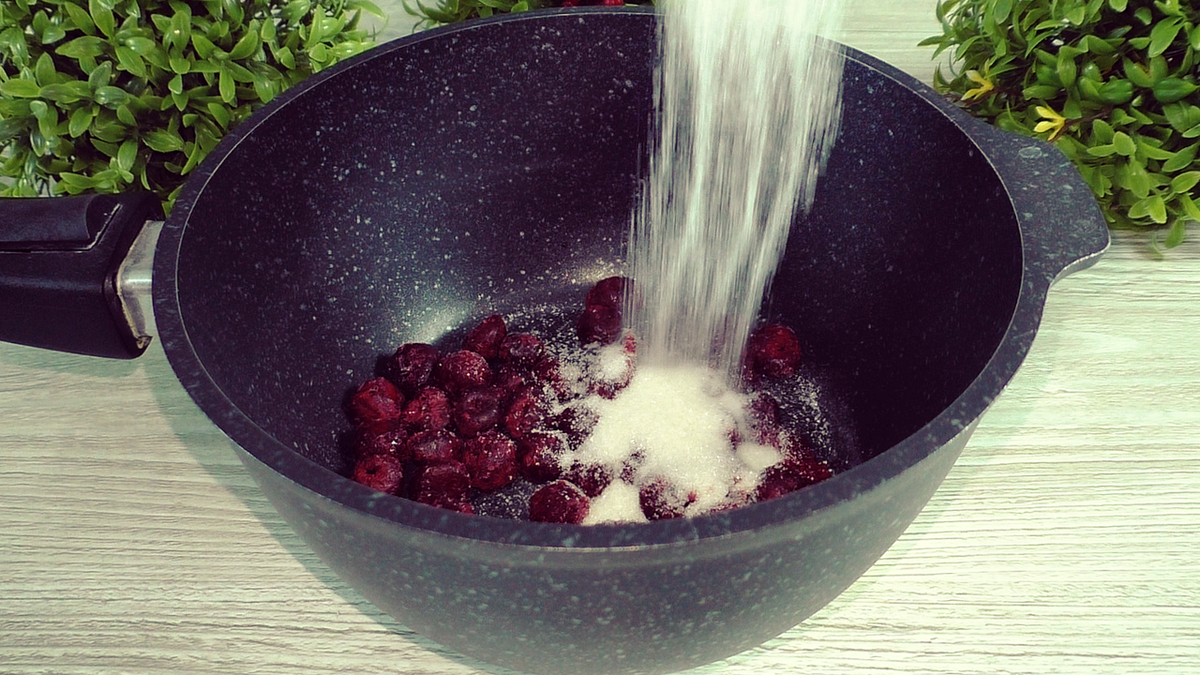 Начинать стоит с подготовки начинки. В небольшой кастрюле смешать замороженные ягоды без предварительного размораживания, добавить сахар по собственному вкусу. На данное количество теста потребуется около 100 граммов ягод, хотя 70 граммов также подойдут.