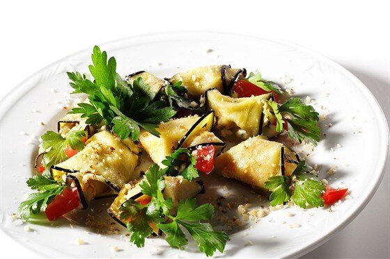 1. Чтобы баклажаны приобрели необходимую текстуру, сначала следует отварить их до полуготовности. Затем обжарить на растительном масле до золотистого цвета. После остывания нарезать баклажаны тонкими ломтиками и свернуть каждый из них в рулетик.