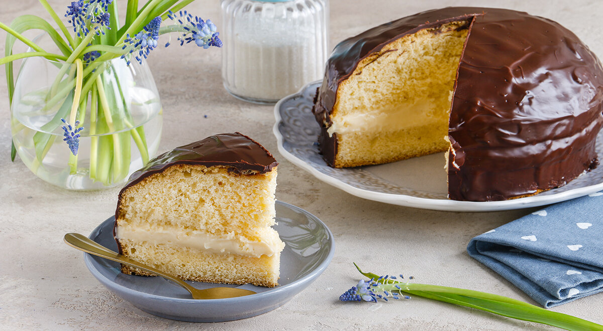 Бисквит: Для начала подготовьте тесто. Взбейте яйца с сахаром и солью до легкой пышной массы. Разогрейте духовку до 180°C, просейте муку вместе с разрыхлителем и быстро добавьте к яйцам. Вылейте смесь в форму диаметром 22-24 см, выстланную бумагой для выпечки. Выпекайте 30 минут.Охлаждение: Достаньте бисквит из духовки, дайте ему немного остыть, затем переложите на решетку. Заверните в пленку и поместите в холодильник минимум на 8 часов.Крем: В небольшой кастрюле взбейте яйцо с обычным и ванильным сахаром, добавьте 180 мл молока. Постепенно добавьте оставшуюся муку и прогрейте на минимальном огне, постоянно помешивая, до загустения. В конце добавьте сливочное масло и охладите.Пропитка: Вскипятите воду с сахаром, дайте остыть, добавьте коньяк. Разрежьте бисквит на два слоя и пропитайте их сиропом.Сборка: На нижний пласт нанесите крем, накройте вторым и слегка прижмите. Приготовьте глазурь из растопленного шоколада и масла, покройте торт сверху и по бокам. Уберите в холод на 2-4 часа.Полезные советы
