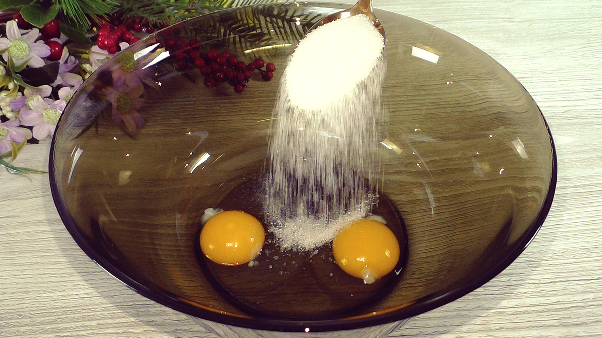 В глубокой миске соединить яйца, добавляя щепотку соли и сахар. Обратите внимание: если хотите менее сладкое печенье, количество сахара можно уменьшить до трёх ложек, так как перед выпечкой печенье обваливают в сахаре.