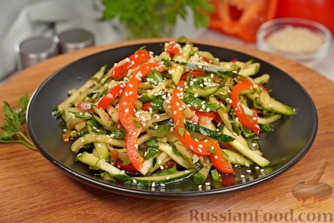 Один из ярких моментов – это салат из огурцов и жареного болгарского перца. Обжаренные с чесноком и красным перцем кусочки перца придают насыщенный аромат, который объединяется с хрустящими огурцами и зеленью. Пикантная заправка с соевым соусом и лимонным соком делает этот салат особенно запоминающимся.