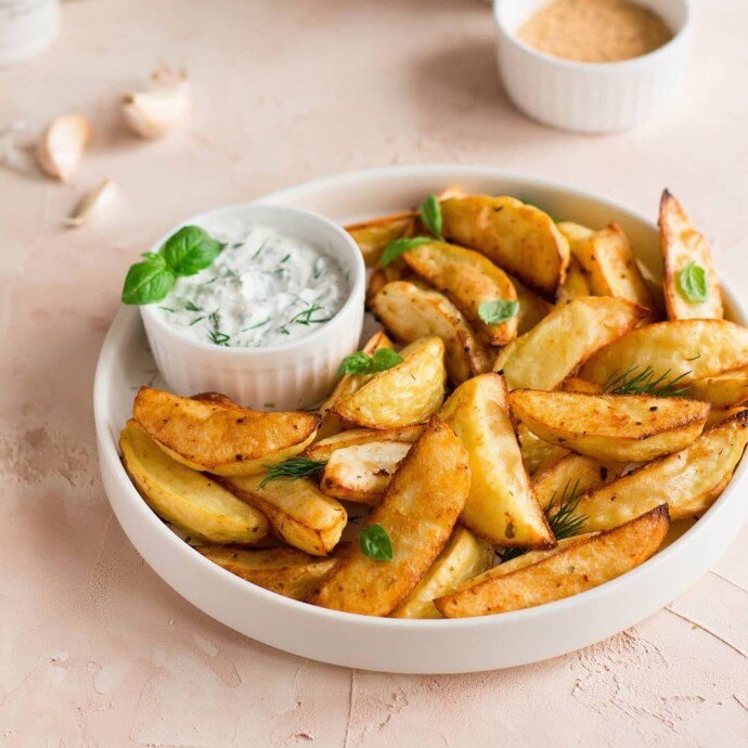 1. Для начала картофель стоит нарезать на крупные дольки и поместить в большую миску. Сбрызните дольки растительным маслом и обильно посыпьте специями. Важно выбирать сорт картофеля, который быстро готовится, но при этом не разваривается. Лучший выбор — картофель среднего размера. Если хотите, можно предварительно отварить дольки на несколько минут, но хороший, свежий картофель тоже отлично подойдёт.