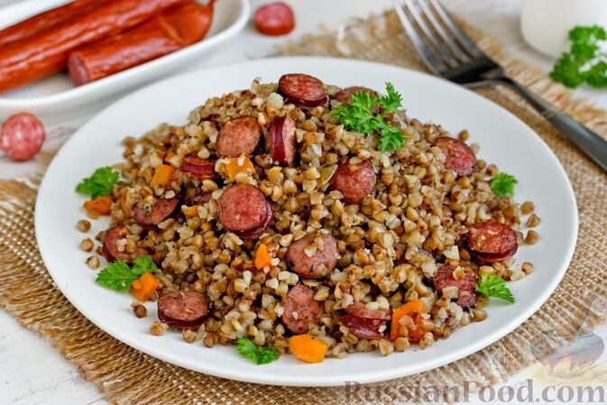 Не стоит забывать и о гречке с копчёными колбасками. В этом случае колбаски обжариваются с луком и морковью, после чего в сковороду добавляется гречка, заливается водой и варится до готовности. В итоге получается полноценное и сытное второе блюдо, которое порадует вас своим вкусом.