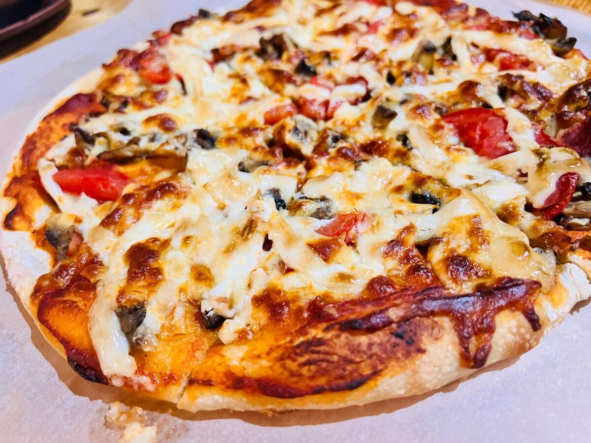 Раскатать тесто в круглый корж. Сильно не переживать о форме — небольшие неровности только добавят уникальности! Смазываем корж томатным соусом, равномерно распределяем обжаренные грибы и ветчину. Сверху щедро посыпаем тертой моцареллой и украшаем половинками помидоров черри. Разогреть духовку до 220°C и выпекать 15-20 минут, пока корка не станет золотистой, а сыр не расплавится.