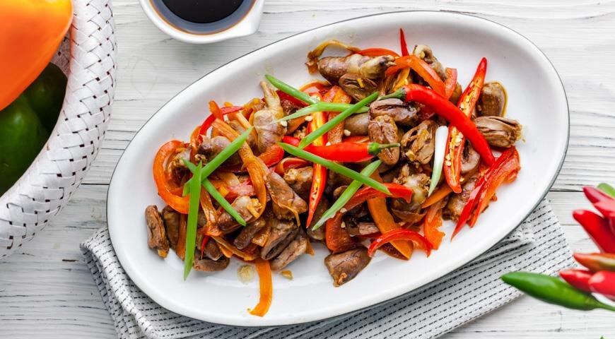 Куриные сердечки в азиатском стиле, приправленные соевым соусом, имбирем и острым перцем, становятся прекрасным выбором для холодного времени года. Это блюдо не только насыщает, но и согревает, радуя яркими цветами и, конечно же, великолепным вкусом.
