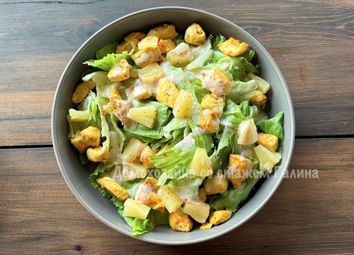 На листы салата выкладывают кусочки индейки, дополненные консервированным ананасом, и всё это щедро посыпают приправой. Завершает блюдо аппетитная заправка, после чего салат готов к подаче на стол — простой, но эффектный.