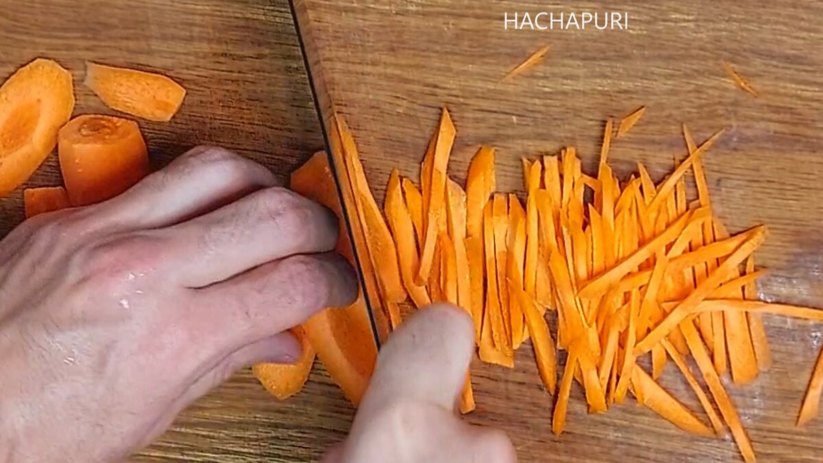 - Сначала нарезать лук и морковь соломкой, затем обжарить на раскалённом масле до появления золотистой корочки.