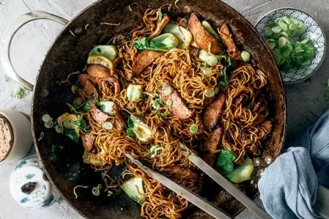 Жареная лапша с кусочками свинины Чар Сиу, известная как Чар Сиу Чоу Мейн, имеет свои корни в южном Китае. Здесь высоко ценятся карамелизированные нотки и хрустящие текстуры. Это потрясающий способ использовать остатки мяса, и порой стоит готовить Чар Сиу исключительно для того, чтобы насладиться этой лапшой.