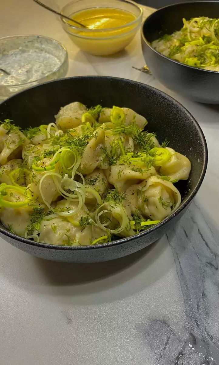 Подавайте пельмени на тарелках, посыпав сверху нарезанным зеленым луком и укропом. Приятного аппетита!