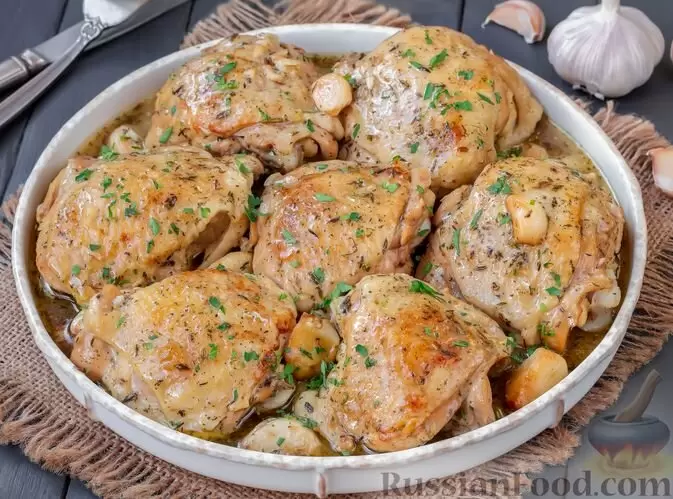 Куриные бёдра в чесночном соусе: румяные бёдрышки, тушенные с чесноком и тимьяном, удивляют своим ароматом. Чеснок здесь играет важную роль, создавая нежный вкус, который приводит в восторг.