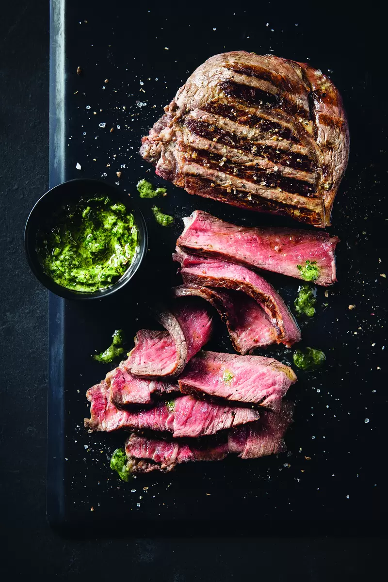 10. При подаче нарезать мясо на тонкие ломтики и дополнить соусом чимичурри.