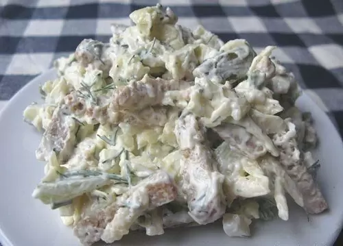 Добавьте сухарики, выдавите чеснок в смесь и при желании добавьте немного молотого перца для остроты. Заправьте все майонезом и перемешайте до однородной консистенции. Чтобы сохранить хрустящую текстуру сухариков, лучше всего подавать салат сразу после приготовления.