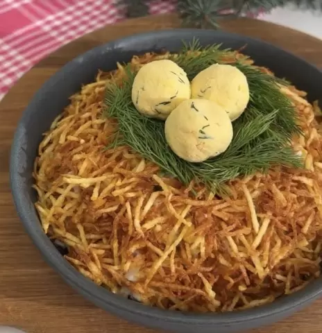 Салат "Гнездо глухаря" — это не только вкусное, но и эффектное блюдо, которое станет настоящей звездой на любом праздничном столе. Сочетающий в себе куриный окорок, нежные белки яиц и хрустящую картофельную соломку, он создает впечатление настоящего гнезда с сюрпризом внутри. А украшение из ярких шариков, приготовленных из желтков и творожного сыра, придаст этому блюду изысканность и оригинальность.