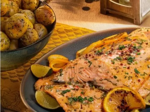 Шаг 7: Выложить лосося на блюдо, рядом разместить картофель, полить соком от рыбы и украсить обжаренными дольками цитрусовых, подавать на стол.