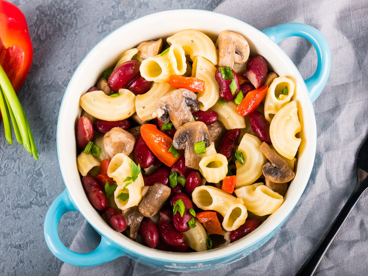 2. Подготовить овощи: нарезать грибы, болгарский перец и зеленый лук. На оливковом масле обжарить лук и перец на среднем огне около двух минут, а отдельной сковороде обжарить грибы до тех пор, пока не испарится вся жидкость. Не забыть слить воду из консервированной фасоли и обсушить её. Все ингредиенты смешать, добавить пасту.