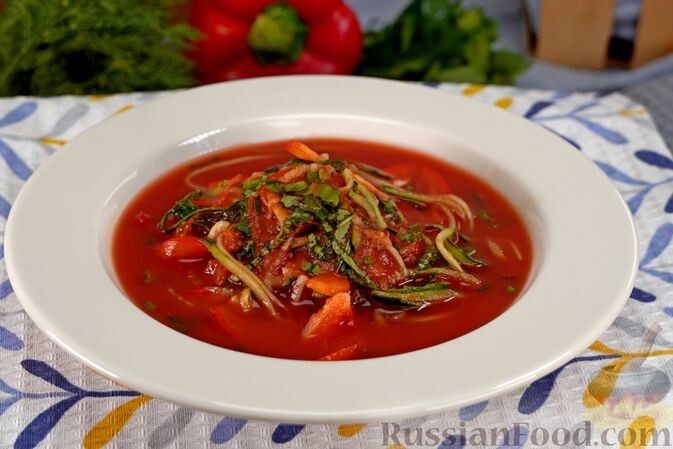 - Холодный овощной суп с томатным соком – простой, но очень вкусный. Он напоминает известное гаспачо и идеально подходит для того, чтобы утолить жажду в жару. Для подачи можно использовать тертые огурцы, что добавит изюминки.