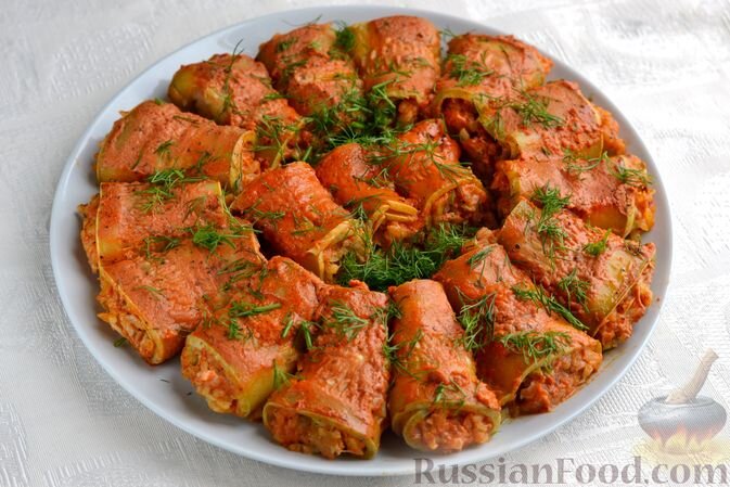 Голубцы из кабачков с соусом: Вместо традиционной капусты используются ломтики кабачков, которые в процессе готовки впитывают ароматный томатный соус, становясь мягкими и сочными.
