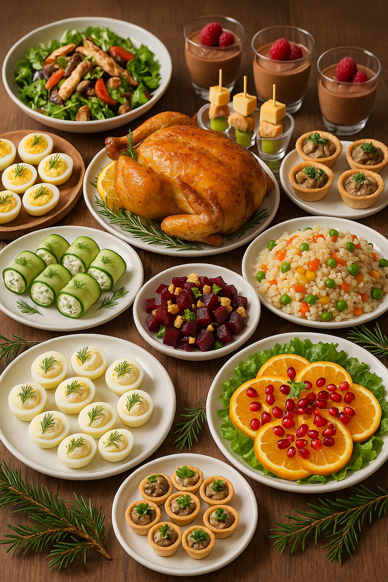Тёплый салат с курицей, грибами и сладким перцем подарит сытую нотку и визуальный баланс; зимний цитрусовый салат добавит яркости и освежит меню. Они дополняют закуски и подстраиваются под настроение праздника — от уютного до слегка нарядного.