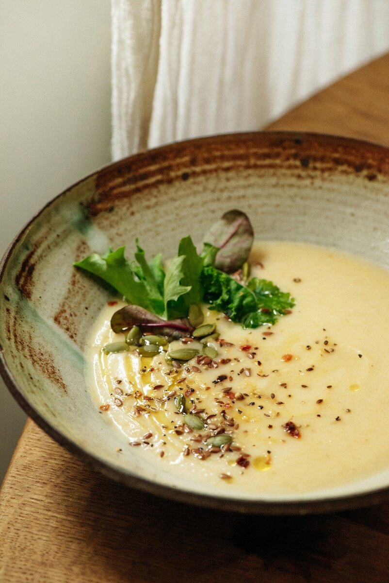 Приготовьте овощи: посолите, сбрызните кокосовым маслом и запекайте в духовке до готовности цветную капусту, лук-порей и морковь.Разогрейте кокосовые сливки в сотейнике, затем соедините их с запеченными овощами и варите еще 7-8 минут. В это время добавьте измельченный чеснок, зиру и куркуму, чтобы раскрыть их аромат.Пробейте суп в блендере до получения однородной, шелковистой консистенции. Если он кажется слишком густым, добавьте немного теплых сливок.Перед подачей добавьте тахини и хорошо перемешайте. Приправьте кунжутным маслом, семенами по вкусу и свежей зеленью.