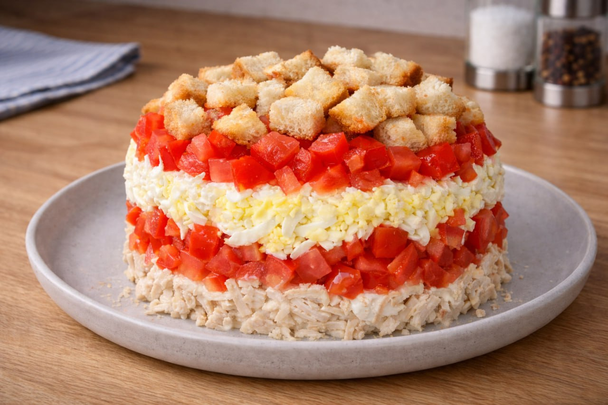 Этот салат удачно сочетает в себе легкость и сытность, а его текстура радует: хрустящие сухарики, нежная куриная грудка и сочные овощи делают его идеальным выбором как для будничного ужина, так и для праздничного стола. Помидоры добавляют сочности, болгарский перец — сладость, а чеснок придаёт легкий ароматный акцент. Сухарики — это тот хрустящий элемент, из-за которого люди возвращаются к добавките снова и снова.