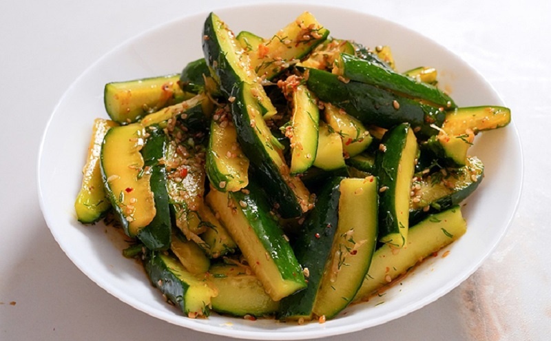 Сначала нарежьте огурцы на крупные дольки и поместите их в большую миску. Затем мелко нарежьте укроп и чеснок, добавьте их к огурцам. Следующий этап — посыпать смесь красным острым перцем и кориандром для придания пикантности.