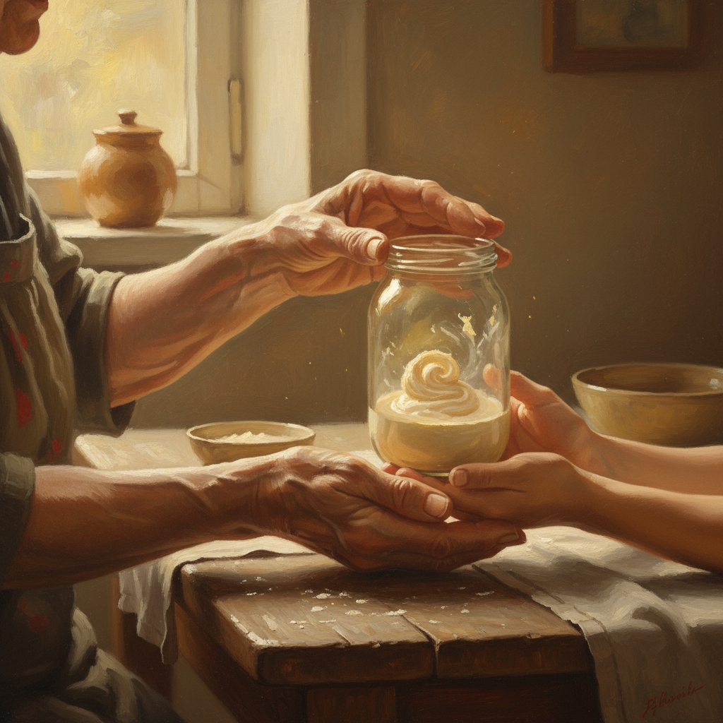 Вдохновила закваску мудрость бабушки. Она отложила немного закваски, и та оказалась у соседской девочки, мечтавшей научиться печь. Девочка заботилась о ней, как о настоящем чуде, и вскоре в её доме также появился ароматный хлеб.