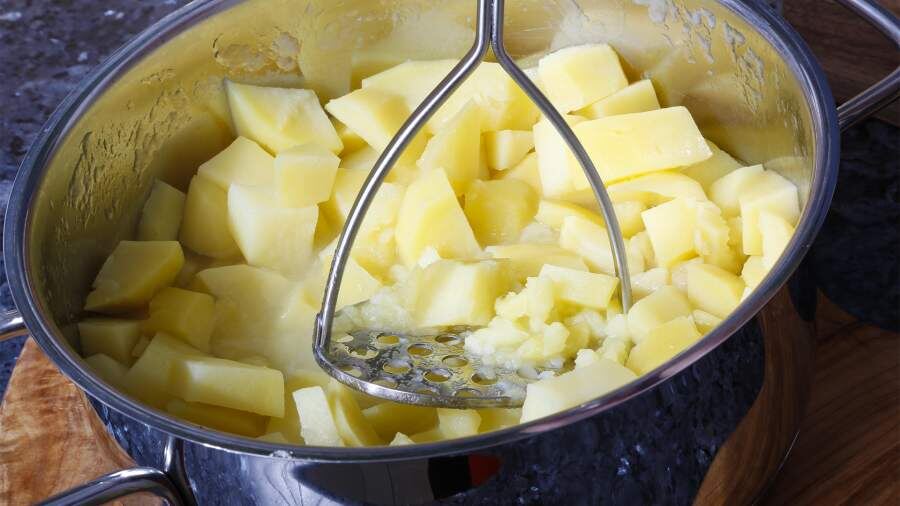 - Сначала размять картофель обычной толкушкой, ничего не добавляя.