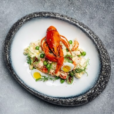 На тарелку выкладывается оливье полумесяцем, сверху украшается перепелиным яйцом, икрой щуки и раковыми шейками.