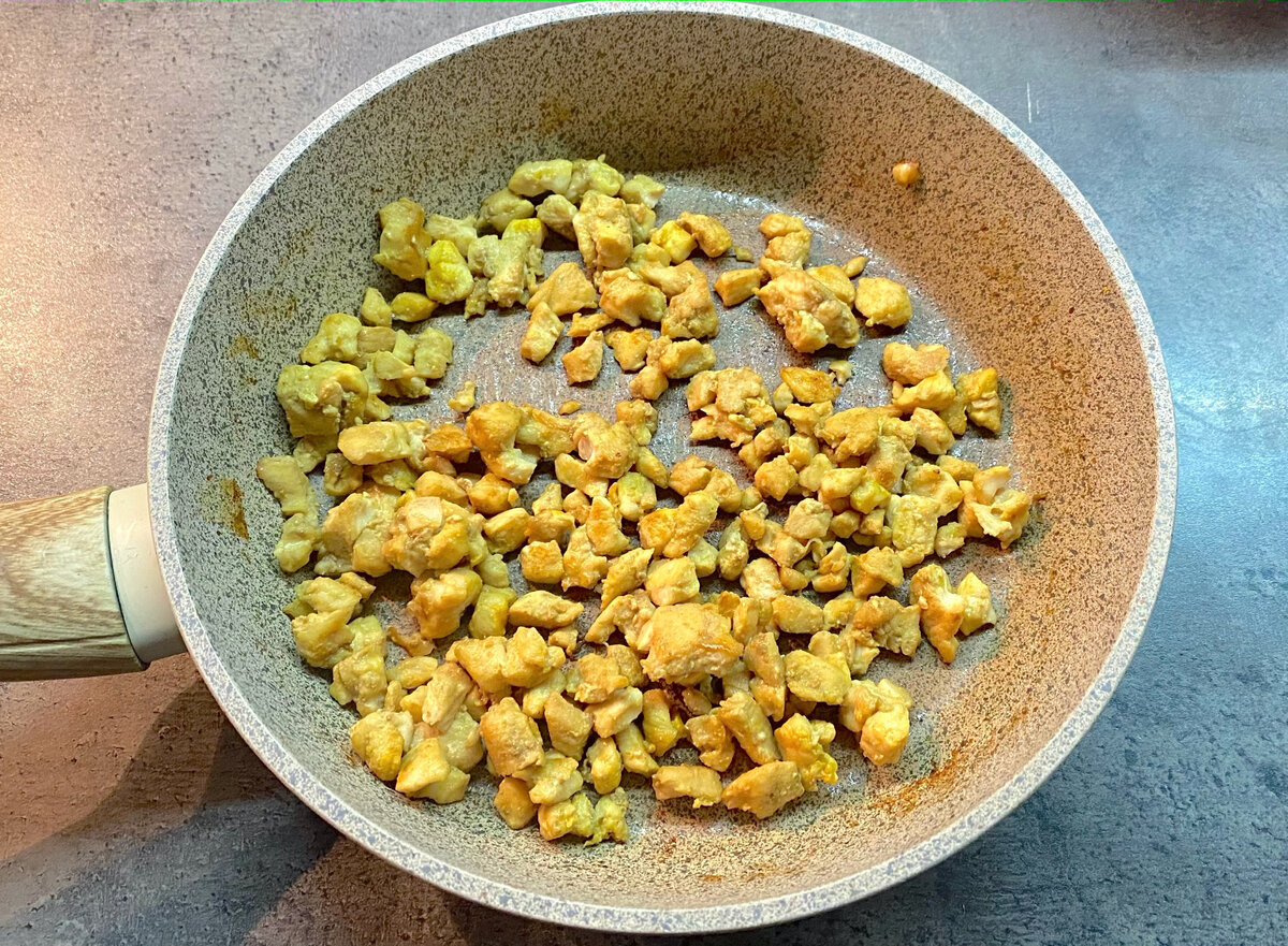 Приготовление салата начинается с тщательной подготовки ингредиентов. Рис необходимо промыть и сварить до состояния готовности, после чего его следует остудить. Куриное филе нарезается на мелкие кусочки и обжаривается на разогретой сковороде с добавлением растительного масла. Для насыщенного аромата стоит полить курицу соевым соусом и добавить карри. Обжаривать достаточно всего 3 минуты, чтобы сохранить сок и мягкость мяса.