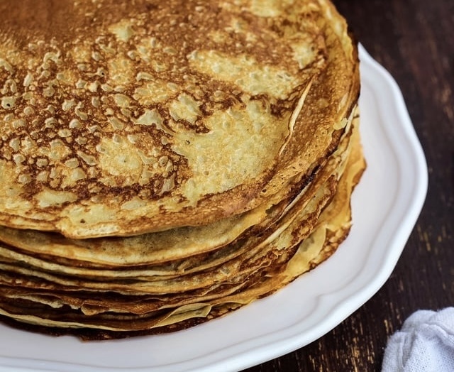 - Кипяток — 200 мл (по желанию для тонких блинов)