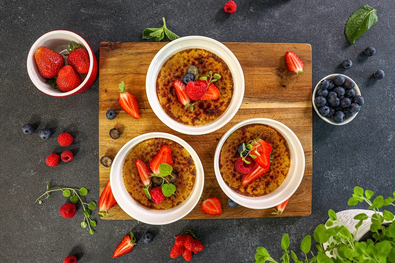 Крем-брюле с сезонными ягодами — это истинное воплощение французского кулинарного искусства, олицетворяющее элегантность и утонченность. Нежный сливочный крем с мягкими ванильными нотами скрыт под хрустящей корочкой карамели, а свежие ягоды придают блюду яркость и легкую кислинку. Этот впечатляющий десерт просто готовить, он станет настоящей звездой как на праздничном столе, так и во время уютного ужина дома. Его баланс текстур и вкусов делает крем-брюле изысканным выбором для любых кулинарных событий.