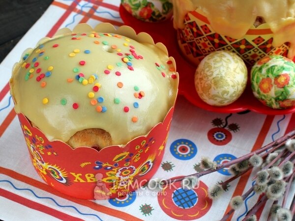 Начнем с основного — кулича, который станет центральным элементом стола. Это классическая выпечка на дрожжевом сметанном тесте с цукатами и сухофруктами. Приготовление не займет много времени, а результат порадует мягкостью и нежностью. Глазурь можно выбрать по вкусу.