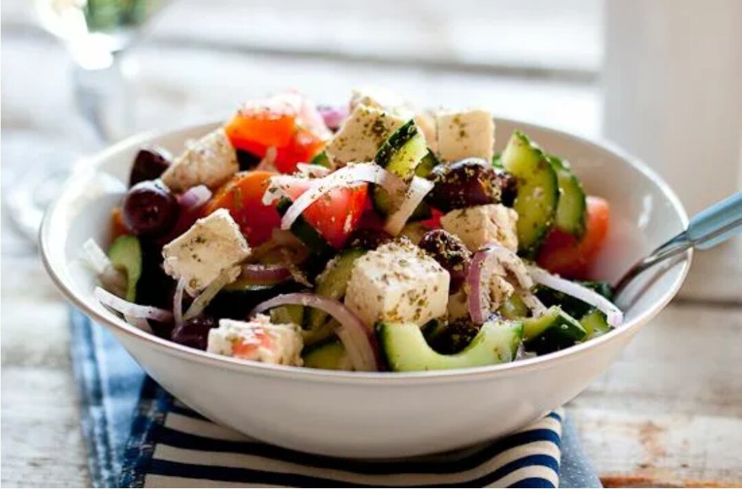 Греческий салат с тофу: возьмите 2 свежих огурца, 2 помидора, пол-лука, 1 болгарский перец и 100 г тофу. Для заправки используют 20 мл соевого соуса, растительное и оливковое масло, сок половины лимона, петрушку и соль.