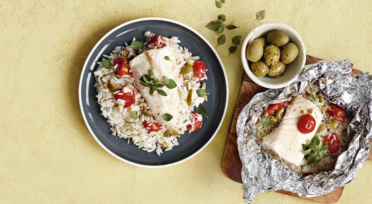 Простой рецепт запеченной рыбы с рисом и помидорами позволит сэкономить время, при этом вы получите вкусное и полезное блюдо. Рыба, запеченная в фольге, останется мягкой и сочной, а рис впитает в себя ароматы оливок и базилика.