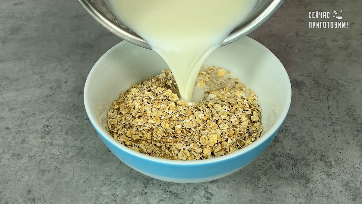 1. В глубокой миске соедините овсяные хлопья с горячим молоком и оставьте их на десять минут. Это нужно для того, чтобы хлопья хорошо впитали жидкость и стали мягкими.