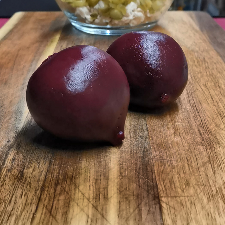 Начнем с самого важного ингредиента — свеклы. Ее нужно отварить, очистить и нарезать кубиками. Не торопитесь, ведь именно она придаст вашему салату основной вкус.