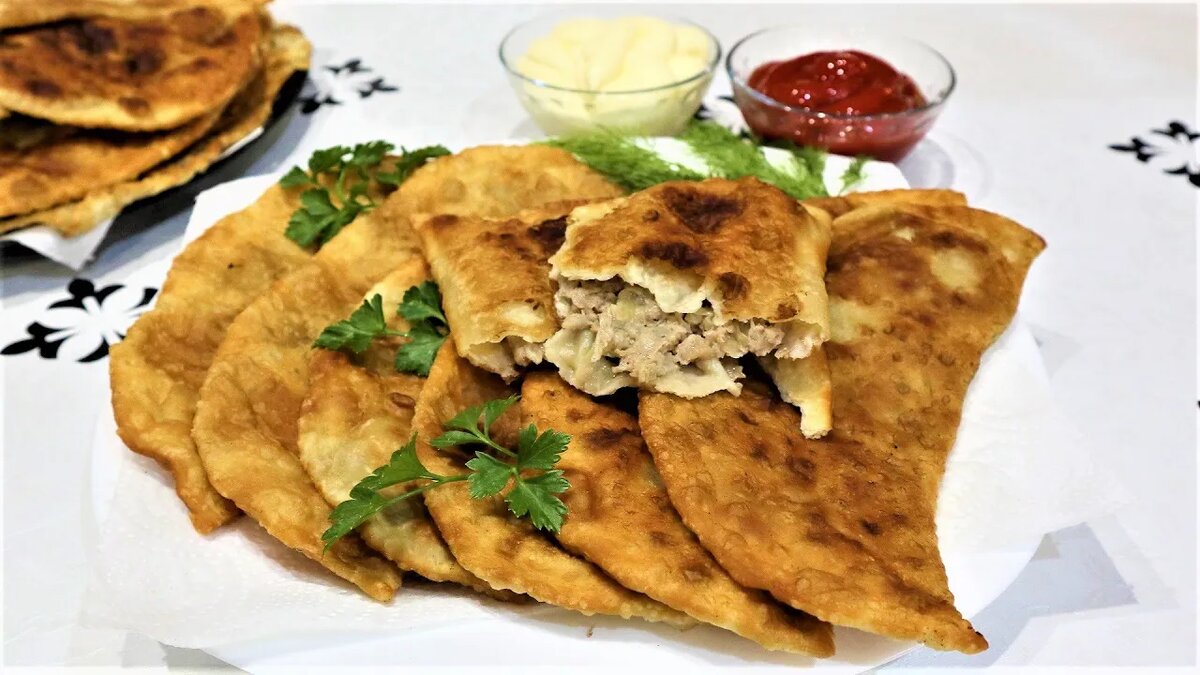 Эти чебуреки — отличный вариант для домашнего угощения, сочетающее в себе хрустящее тесто и насыщенную начинку. Чтобы сделать тесто, следует тщательно перемешать все ингредиенты до получения однородной массы и оставить его на некоторое время для настойки. Тем временем подготавливается начинка: лук нарезать и смешать с фаршем, добавив соль и перец по вкусу. Когда тесто готово, его необходимо раскатать, вырезать круглые основания для чебуреков, заполнить начинкой и, наконец, обжарить в горячем растительном масле до золотистой корочки.
