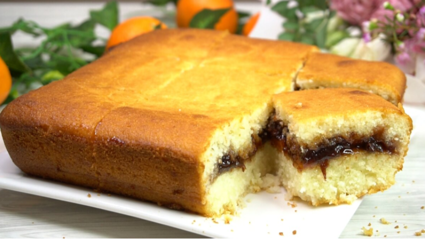 По истечении времени, на тесто выкладывается густое повидло, после чего заливается оставшаяся часть теста. Выпекаем ещё 40 минут, ориентируясь на готовность.