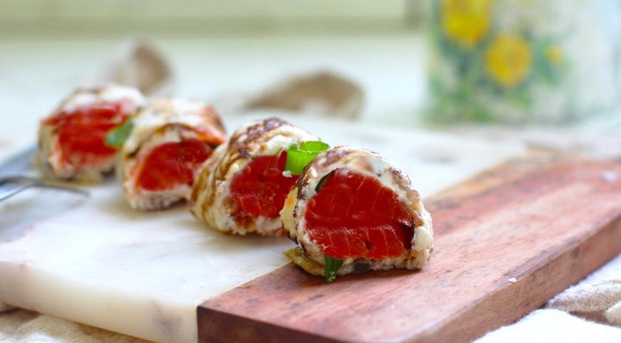 Шаг 4: Готовый блин переложить на тарелку, смазать творожным сыром или гладким творогом, затем добавить ломтик соленого лосося и немного нарезанного зеленого лука. Завернуть блин в рулет и нарезать на порционные кусочки.