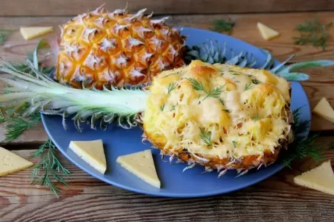 Далее духовой шкаф разогревается до 180 градусов. Полученная начинка выкладывается обратно в ананасовые половинки или в маленькие жаропрочные формы, сверху посыпается оставшимся сыром и кладутся небольшие кусочки сливочного масла для румяности. Выпекать необходимо в течение 15–20 минут до тех пор, пока сыр не подрумянится и не образует золотистую корочку.