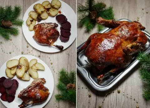 Начинить утку кусочками яблок и зашить отверстия, чтобы избежать вытекания сока. Смешать соевый соус с яблочным уксусом и медом, обмазать приготовленной смесью всю утку. Запекать на решетке с противнем для сбора жира. Совсем рядом можно завернуть в фольгу свеклу для гарнира, которая станет отличным дополнением к основному блюду.