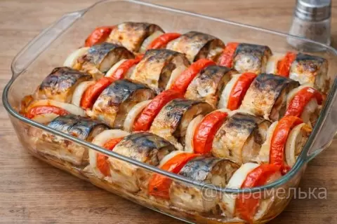5. Формирование блюда: На смазанное маслом противень выложить половину лука, затем скумбрию и помидоры, полив остатками маринада.