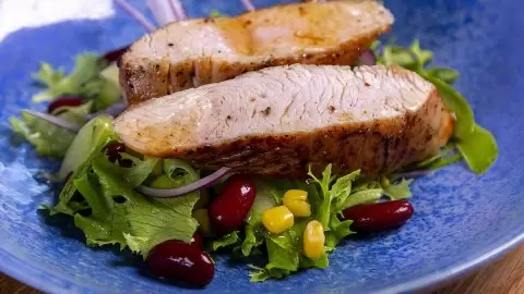 4. Выложите салат на тарелку, сверху разместите сочную индейку, и наслаждайтесь этим великолепием!