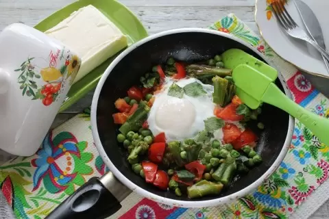 В центр овощной смеси разбить яйцо, накрыть крышкой. Готовить до тех пор, пока белок не станет белым, а желток останется слегка жидким.