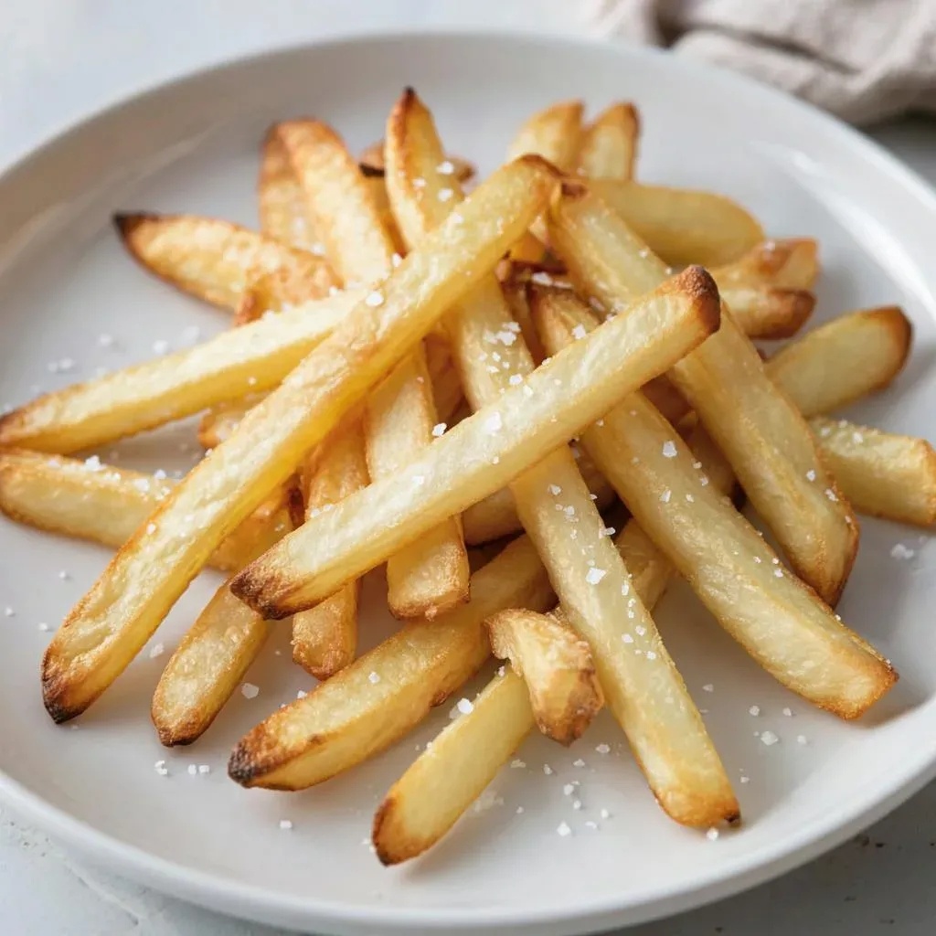- Процесс: Нарезать картофель длинными полосками, замочить в холодной воде на 30 минут, обсушить, обжаривать в два этапа — сначала при температуре 160°C, затем при 180°C до золотистой корочки.